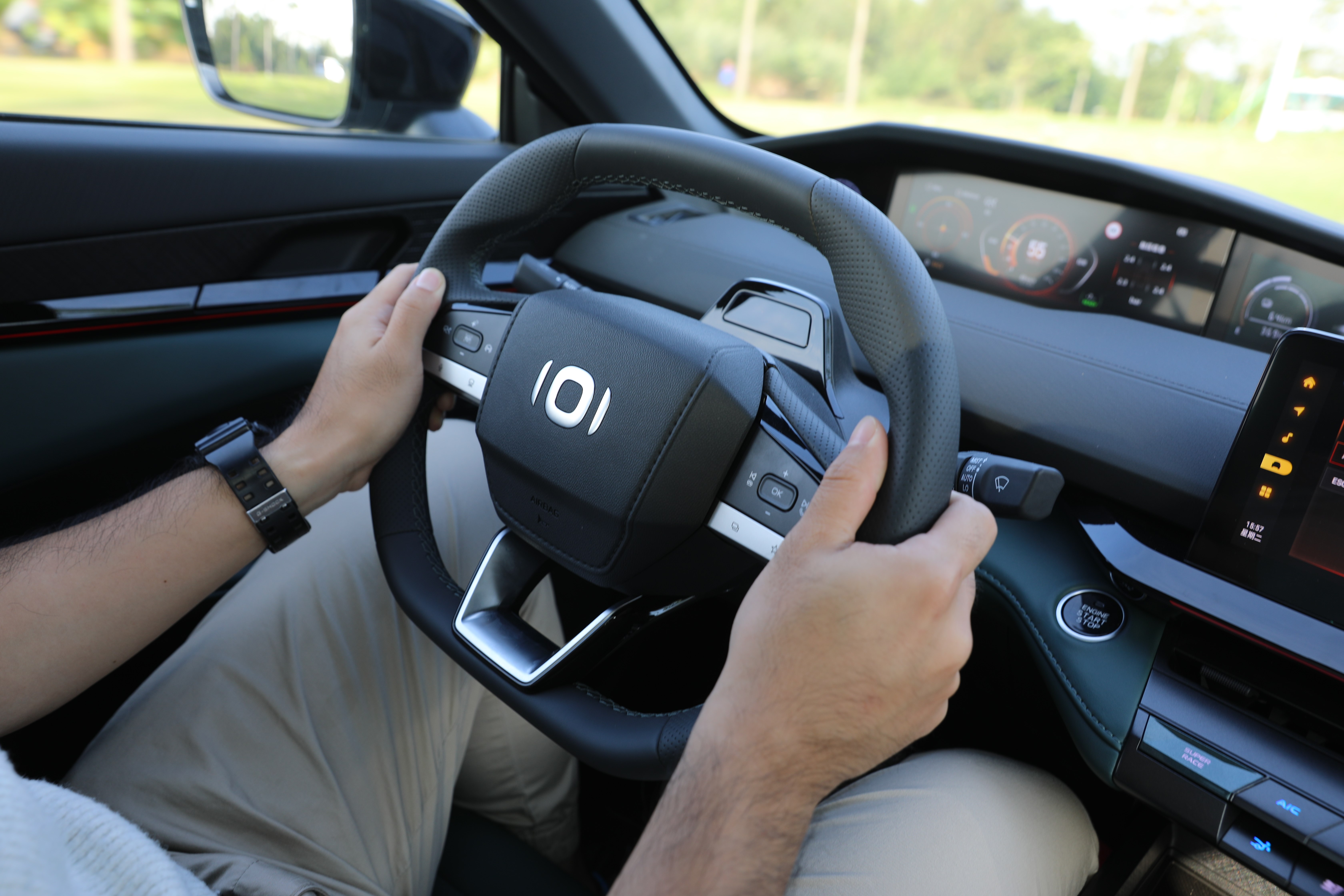 智能驅(qū)動模式能夠幫助車輛在不同電量狀態(tài)下,以最優(yōu)的驅(qū)動結(jié)構(gòu)對動力進(jìn)行分配,而當(dāng)筆者啟動SUPER RACE模式,首先映入眼簾的是儀表盤、中控屏切換到更激進(jìn)的界面UI,其次,車輛的動力進(jìn)入到嚴(yán)陣以待的狀態(tài),油門響應(yīng)更為積極,配合模擬聲浪,整車的運(yùn)動氣質(zhì)完全展現(xiàn)出來。