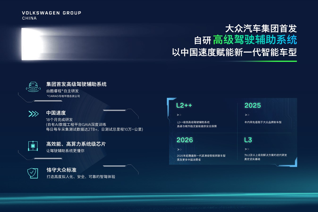中國(guó)速度,本土研發(fā)——由集團(tuán)中國(guó)團(tuán)隊(duì)研發(fā),專為中國(guó)復(fù)雜多樣的路況量身打造的高級(jí)駕駛輔助系統(tǒng)首次亮相。依托高效能、高算力的系統(tǒng)級(jí)芯片(SoC),經(jīng)由酷睿程自有AI數(shù)據(jù)工程平臺(tái)GAIA充分訓(xùn)練,該系統(tǒng)可最高實(shí)現(xiàn)L2++級(jí)別高級(jí)駕駛輔助功能,支持用戶快速應(yīng)對(duì)各種復(fù)雜路況。該系統(tǒng)將在今年率先搭載于一款面向中國(guó)市場(chǎng)的大眾品牌新車型,并計(jì)劃于2026年進(jìn)一步應(yīng)用到基于CMP平臺(tái)開發(fā)、搭載CEA電子電氣架構(gòu)(China Electronic Architecture)的全新智能網(wǎng)聯(lián)車型,滿足更多主流緊湊型細(xì)分市場(chǎng)消費(fèi)者的需求。