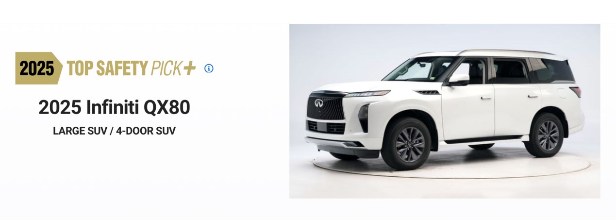 以安全為豪華的最大底線,QX80打造了超高強(qiáng)度車身,并搭載ProPILOT智能駕駛輔助系統(tǒng)、底盤透視影像系統(tǒng)等多維智能科技,榮獲2025年度IIHS美國公路安全保險(xiǎn)協(xié)會(huì)“TOP SAFETY PICK+”最高安全評(píng)級(jí) 。