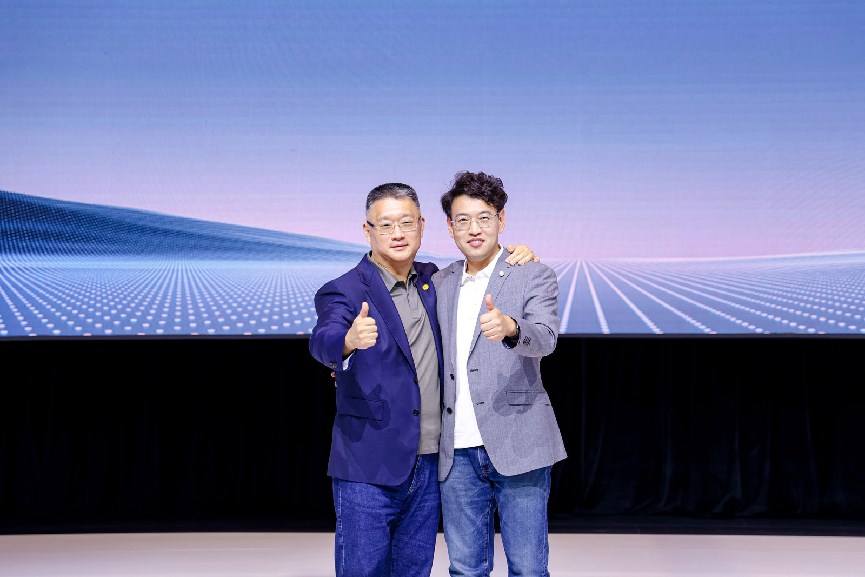 上汽集團(tuán)總裁賈健旭(左)與火山引擎汽車總經(jīng)理?xiàng)盍ィㄓ遥┖嫌?
