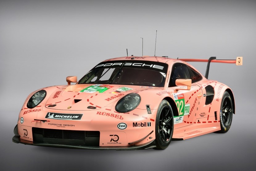 毫無疑問,這是一款現(xiàn)代化的賽車——911 RSR(991),其出征了 2018 年的勒芒 24 小時耐力賽 GTE-Pro 組別的角逐。最終這臺身披“粉豬”涂裝的 92 號 911 RSR 賽車在與法拉利、寶馬、福特、克爾維特、阿斯頓·馬丁五大制造商車隊的同場競技中斬獲組別冠軍。更值得一提的是,雖然未出現(xiàn)在展臺,但身披樂富門涂裝的 91 號911 RSR賽車斬獲亞軍,包攬組別前兩名。這款“粉豬”涂裝的 92 號 911 RSR 賽車不由令人想起保時捷 917/20 賽車征戰(zhàn) 1971 年勒芒比賽時的情景。車身圖案為粉色豬肉切割圖的樣式,這一由保時捷設(shè)計師 Anatole Lapine 提出的設(shè)計理念在當(dāng)年的法國薩爾特省引起轟動。時至今日,被稱做“松露獵人”的保時捷 917/20 賽車仍是最著名的保時捷賽車之一。