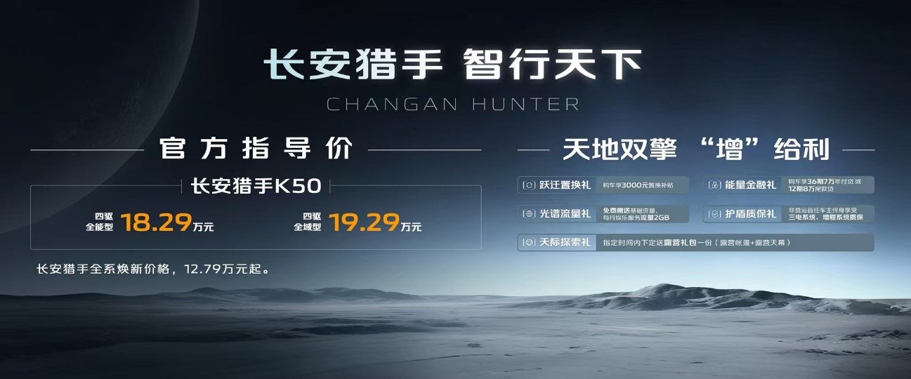 長(zhǎng)安獵手K50四驅(qū)全域型,讓遠(yuǎn)方?jīng)]有邊界,官方指導(dǎo)價(jià)19.29萬元;