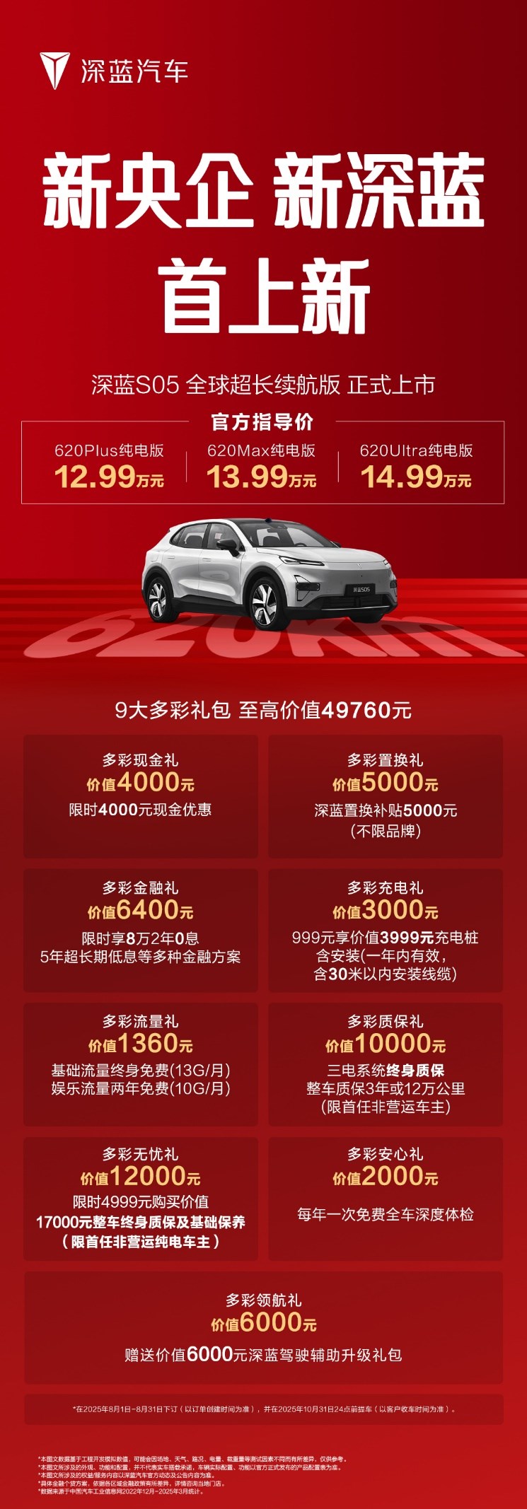 據(jù)官方介紹,用戶8月31日前下訂即享多彩現(xiàn)金禮、多彩置換禮、多彩金融禮、多彩充電禮、多彩質(zhì)保禮等9大多彩禮包,至高價(jià)值49760元。禮包包含4000元現(xiàn)金優(yōu)惠、5000元深藍(lán)置換補(bǔ)貼、2年0息或5年低息金融方案、三電系統(tǒng)終身質(zhì)保、深藍(lán)駕駛輔助升級(jí)禮包等超值權(quán)益。